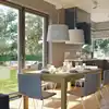 Das Modell H1 besitzt einen leichten, schlichten Körper mit einem Satteldach. Der Wohnbereich umfasst ein hohes und gut einrichtbares Wohnzimmer, das mit dem Esszimmer und mit der Küche verbunden ist. Im privaten Teil befinden sich drei bequeme Schlafzimmer, die an zwei Ebenen angeordnet sind, und ein Erholungsbereich mit zahlreichen Abstellflächen, die entsprechend genutzt werden können. Dank der Panoramafenster ist das Haus sehr hell und offen, in dem man den Garten, unabhängig von der Jahreszeit, genießen kann.