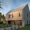 V3 ist ein Haus des Typs Scheune, in dem es viele offene Räume und Verglasungen gibt. Es verbindet zwei Körper in sich: den Hauptkörper mit einem Satteldach und den Eingang, sodass eine T-förmige Bebauung mit einem Dachgeschoss auf einem rechteckigen Grundriss entsteht. Der kompakte Hauptkörper mit leichten Unterschnitten und die Kombination von zwei kontrastierenden Fassadenstoffen verleihen dem Gebäude einen individuellen Charakter.